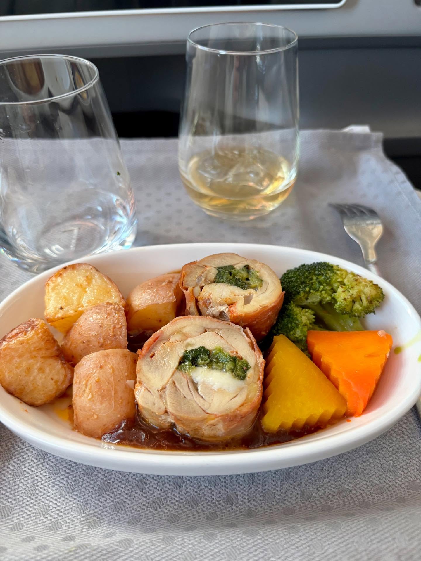 這班是下午航班,供應的是輕食餐點。我選了看起來最安全的「西式雞肉洋芋什麼什麼」(名字我真的沒記住),雞肉本身調味不錯,肉質扎實但不柴,醬料則偏淡一些,少了點驚喜。不過整體口感平衡,算是穩定發揮。飯後一如既往有一杯哈根達斯冰淇淋,口味不錯、口感依舊硬得像石頭,幾乎成了長榮飛機餐的固定笑點。