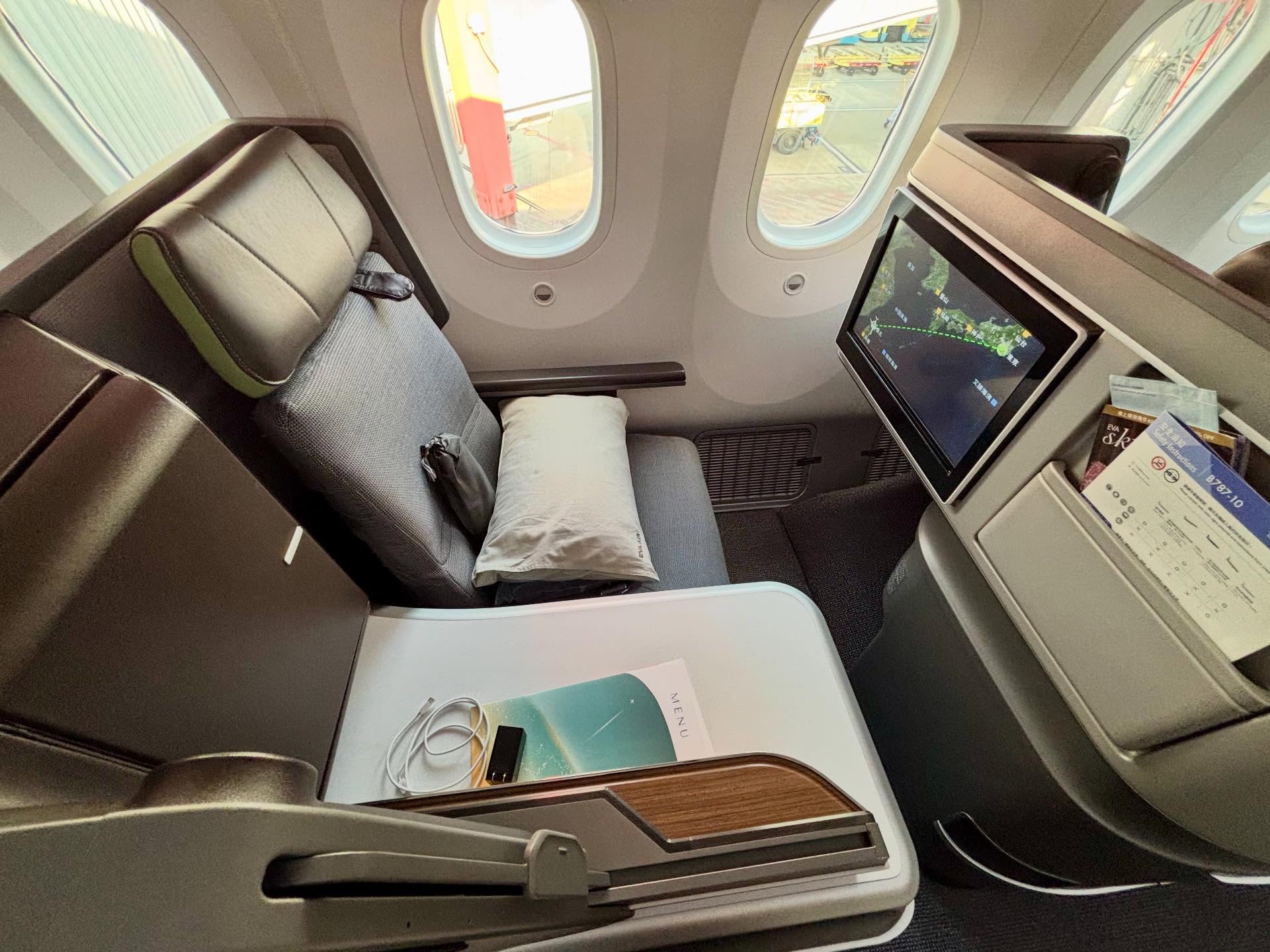 787-10 的機艙自然不讓人失望,電子舷窗依舊是我最喜歡的設計之一——但這次不知道為什麼,飛到後段時整艙的窗戶被統一「強制調暗」成全黑模式,幾乎看不見外頭的景色。可能是為了讓乘客休息,也可能是航務規範,不過對於想看夜景的我來說還是有點失落。