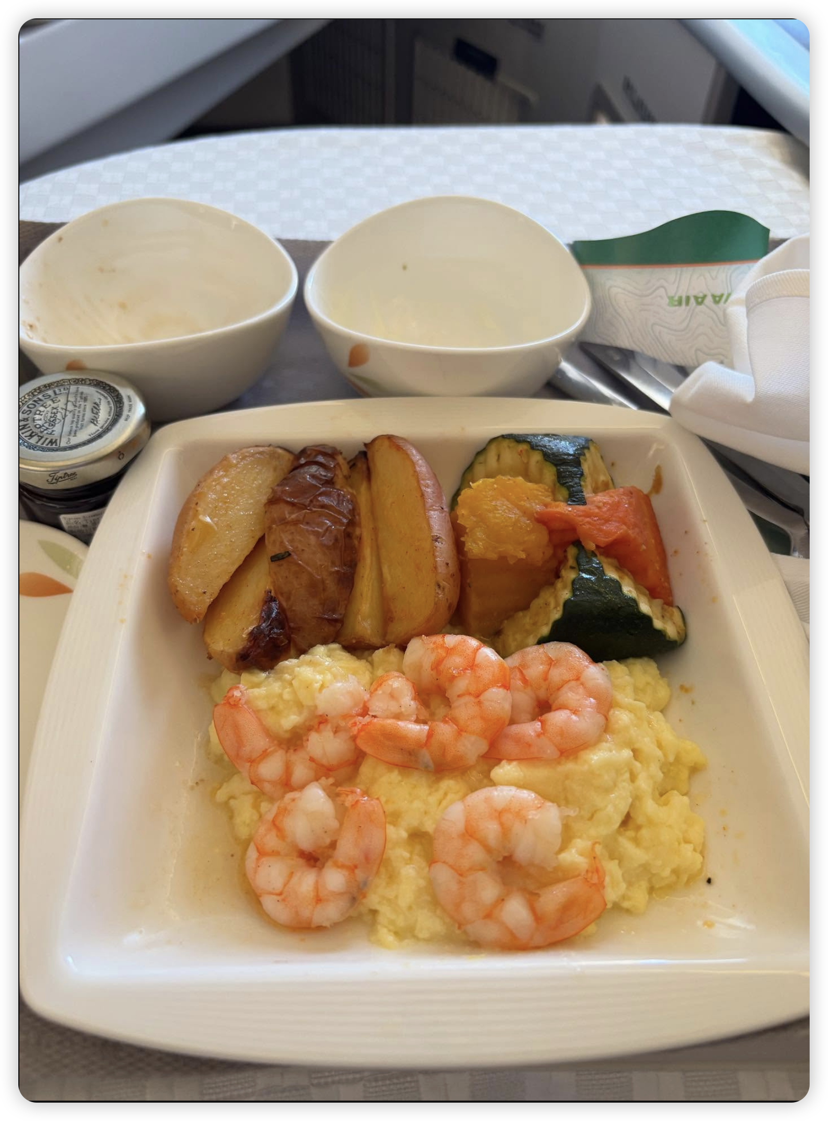早餐分成前菜與主菜分別上桌,儀式感十足。前菜是一份帶著堅果的奶酪(有點像優格與布丁的混合口感),上頭點綴著水果,但那顆蘋果就真的是普普通通。幸好整體味道不錯,奶香濃郁,堅果增添了口感變化。主菜我選了「蝦仁炒蛋配馬鈴薯與節瓜」(336 kcal),另一個選項是清粥小菜,但早班機我實在點不下去粥。結果這道炒蛋意外地好吃,蝦仁的彈牙與蛋的滑嫩搭配剛剛好,馬鈴薯烤得鬆軟,節瓜則清爽解膩,讓早餐多了一點層次感。比起許多航空的「能吃就好」飛機餐,這份早餐真心覺得用心。