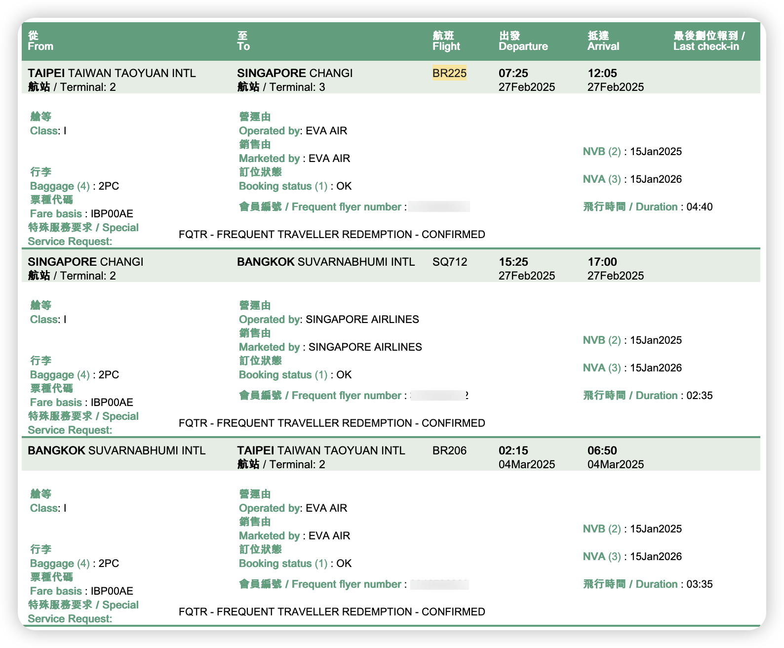 這次整趟旅程是新加坡—曼谷—台北的行程。去程由 BR225 送我抵達新加坡,再轉搭 新航 SQ712 前往曼谷,最後在 3 月 4 日凌晨搭乘 長榮 BR206 由曼谷回台北。三段航程全數都是商務艙,單人 70,000 哩加 3,500 TWD 稅金,能一次體驗長榮與新航不同風格的服務,算是這趟旅程的亮點之一。