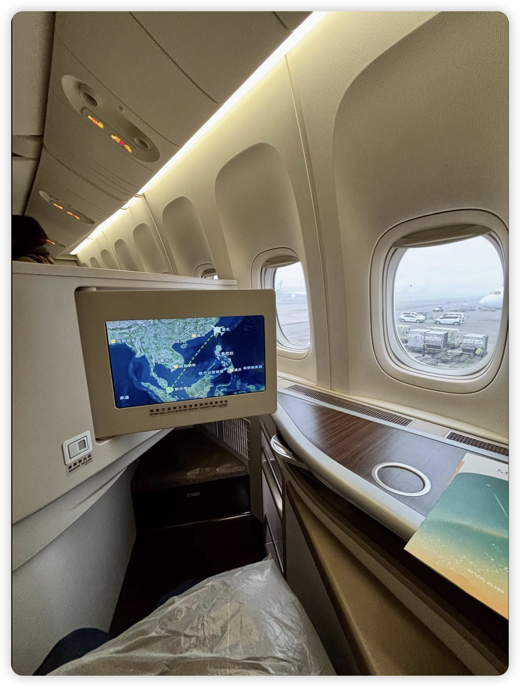 這次是用里程票換的行程,單人來回總共扣掉 70,000 哩程,另加上 3,500 TWD 稅金與附加費。其實划算與否見仁見智,但對我來說,能在早晨坐上長榮的皇璽桂冠艙,光是體驗就值得。BR225 採用商務艙 1-2-1 反魚骨布局,每位乘客都有獨立的進出空間,座椅寬敞,完全可以調整到平躺模式。從起飛到降落的過程中,不論是隱私感還是舒適度,都比經濟艙完全是另一個世界。