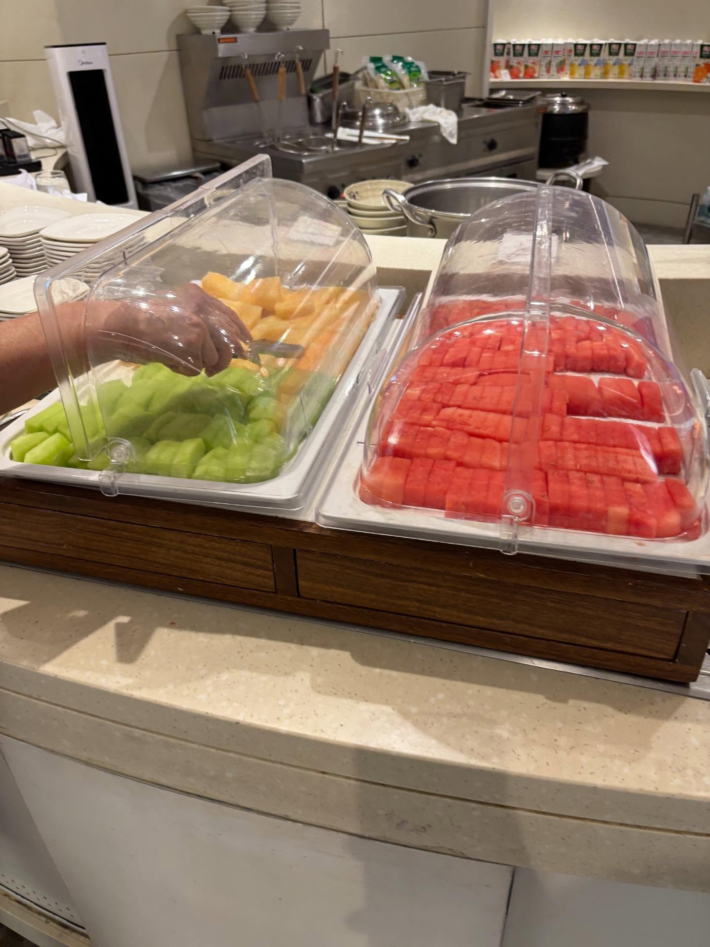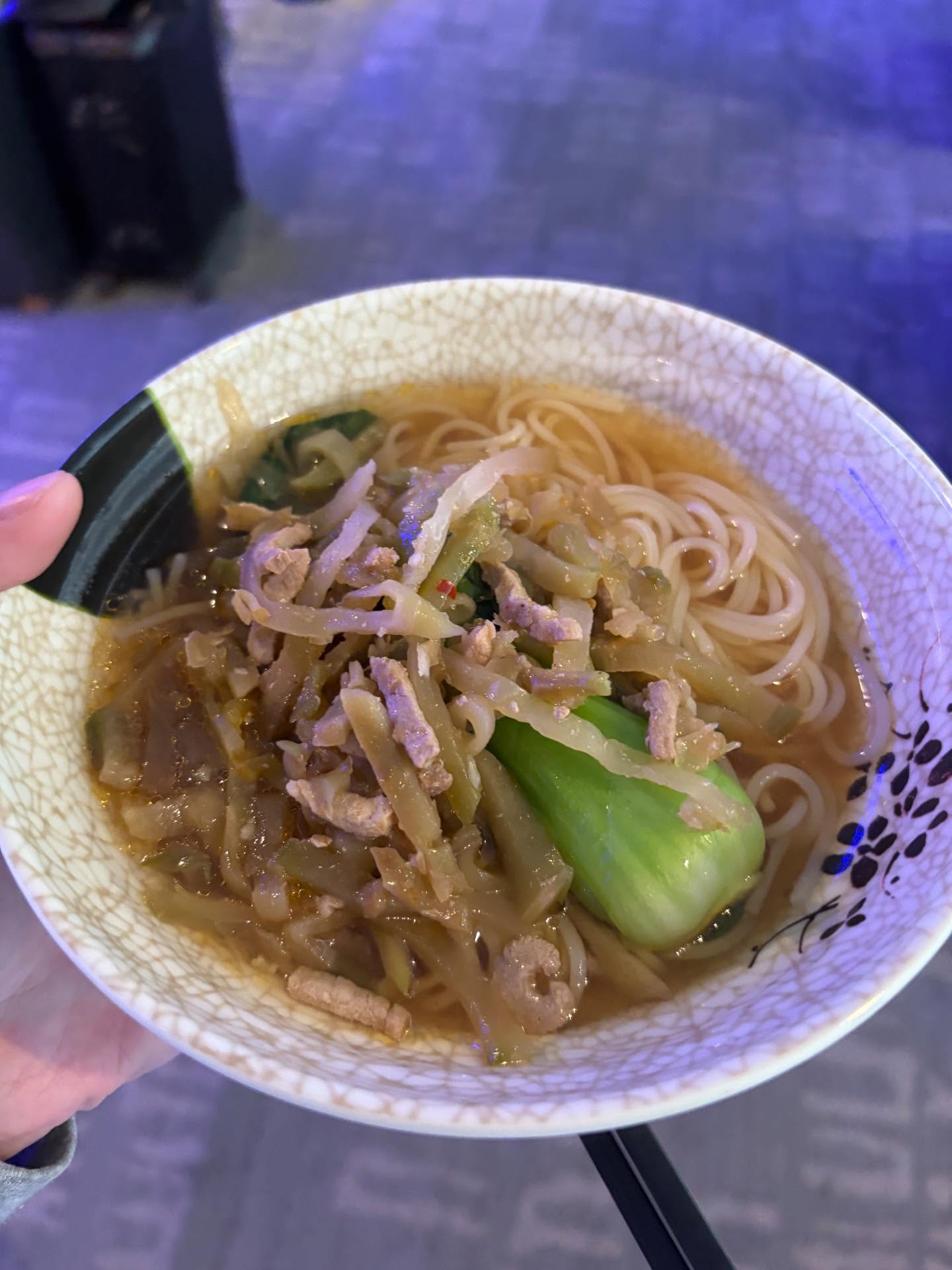 長榮在浦東使用的是 中國國際航空(Air China)貴賓室,分為上下兩層。空間不算擁擠,但整體氛圍偏商務風格,配色以深木與灰金為主,沒有太多驚喜。餐食的選擇「有但不多」,該有的都有,但好吃的不多。那碗 榨菜肉絲麵 看起來香氣十足,實際上卻普普通通,湯頭有點油,麵體也稍嫌軟爛。