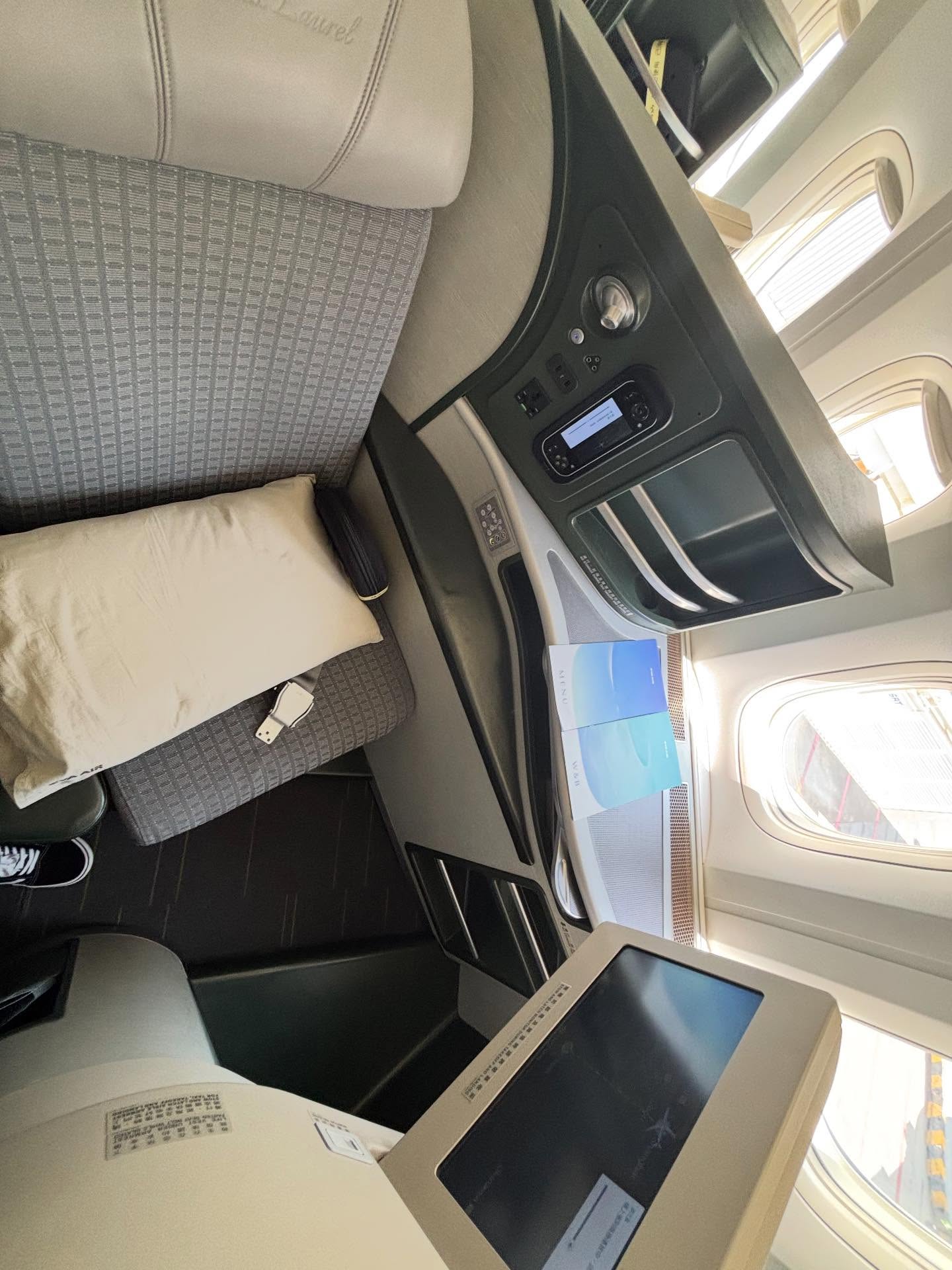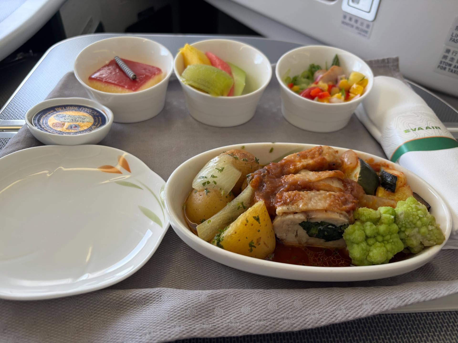 登機後,熟悉的長榮服務讓人回到熟悉節奏。這架 B777-300ER 的機艙仍然維持不錯的狀態,雖然比不上 787-10 那種新機的亮眼,但乾淨度與整潔度都很到位。照例我點了一杯 鮮榨鳳梨汁,香氣依舊迷人,酸度溫和、口感順滑,是近幾次航程中我最喜歡的小確幸之一。