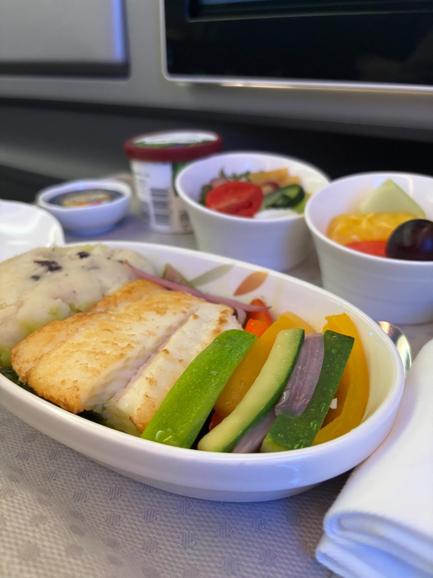餐點方面我選了魚料理(記得是比目魚什麼什麼的,具體名字已經忘記了,但可以參考我上一篇的菜單)。魚肉非常嫩,調味清淡卻不乏層次;一旁的洋芋配菜就稍微普通了點,偏乾且味道不太突出。整體吃下來中規中矩,但仍比多數短程航班的熱食來得細緻。飯後甜點當然少不了一球哈根達斯,味道依舊熟悉——但那該死的封膜一如既往地難撕開,等我成功打開時飛機都快開始下降了。