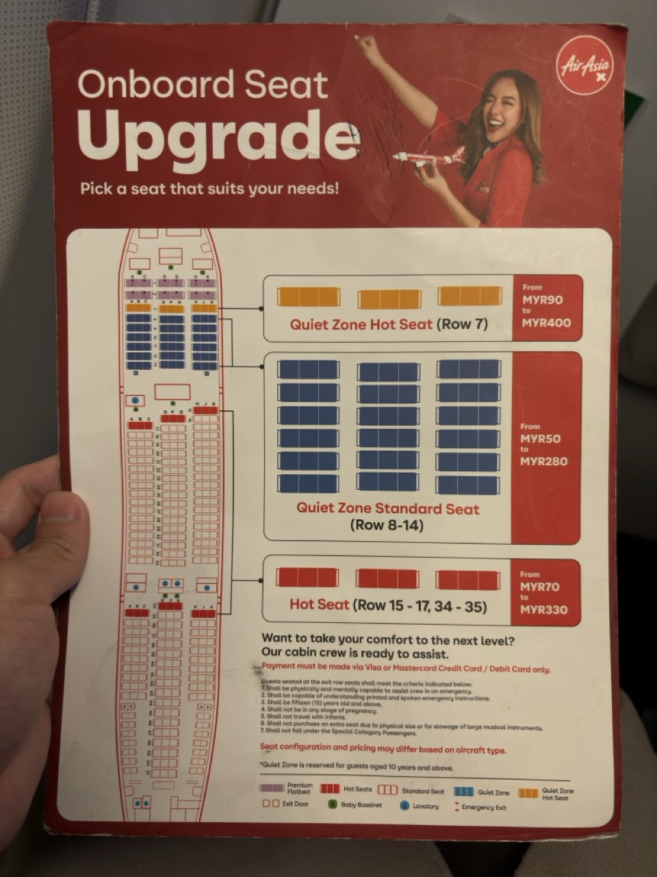 這次搭的是 AirAsia 的 9M-XXD Airbus A330-343,機齡大概 16 年的老朋友,但意外地還挺穩、挺安靜。因為這趟帶著相機又怕被抓手提行李重量還要拖著行李,乾脆一次買到最高級的方案加上 FastPass。能選任何座位、附兩次免費改票、還送一份飛機餐聽起來都很爽,外加 RM50 的免稅折價券——結果這架不知道為什麼完全不能線上預購免稅,折價券根本沒用 : ( 飛這航線別浪費錢買這爛方案